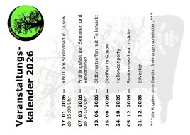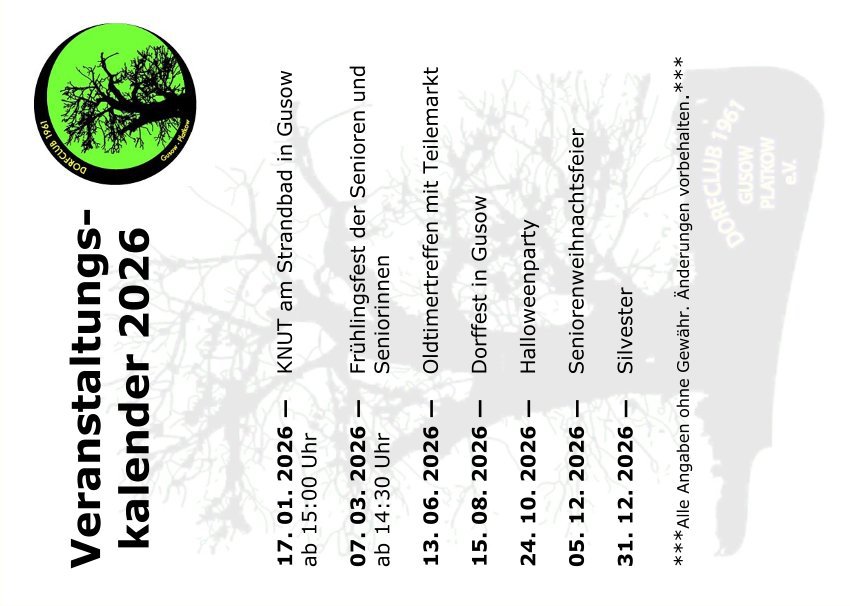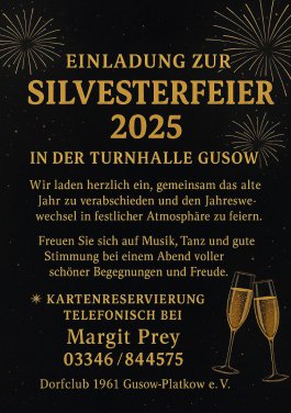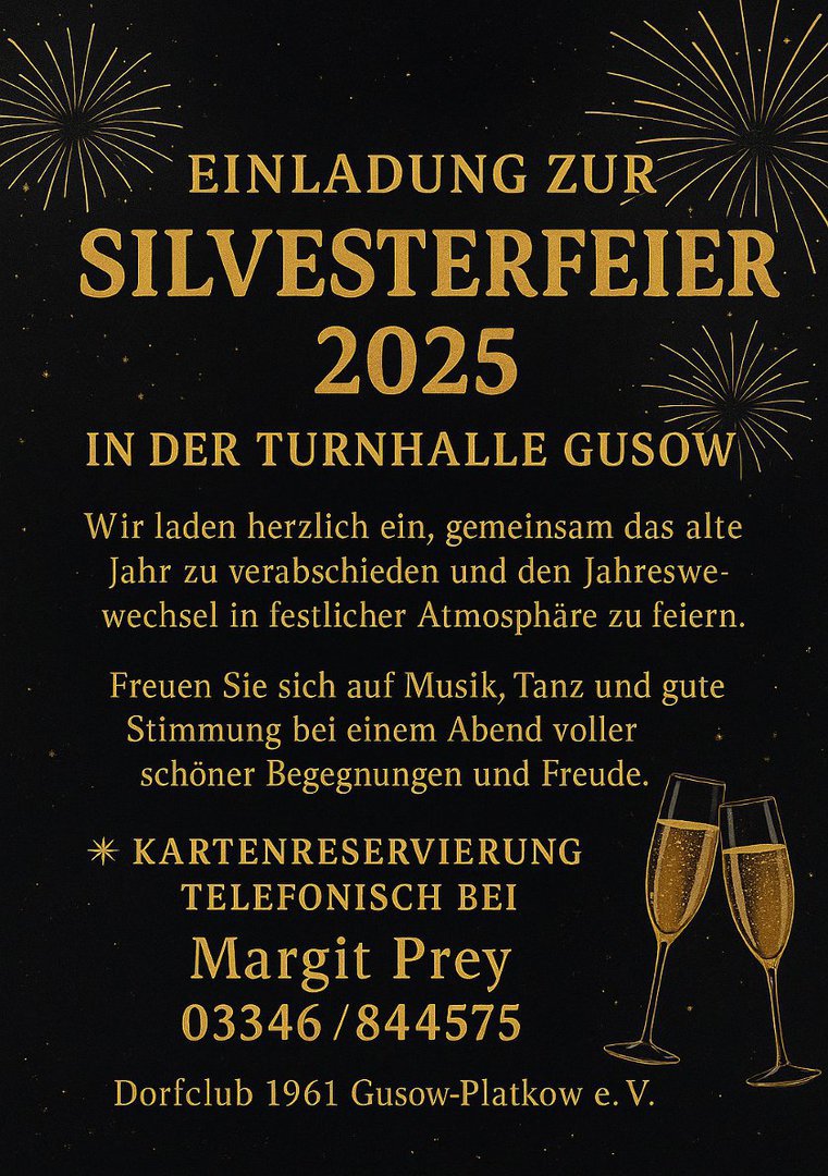 Vielleicht sehen wir uns ja zum Jahresabschluss bei unserer jährlichen Silvesterparty in der Mehrzweckhalle in Gusow. Infos und Tickets gibt es bei Gabi Becker unter der Telefonnummer: 0162 9874194.